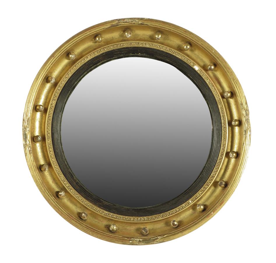 A 19th century giltwood convex wall mirror, the circular plate within an ebonized reeded slip and a ball decorated frame, 57cm diameter.