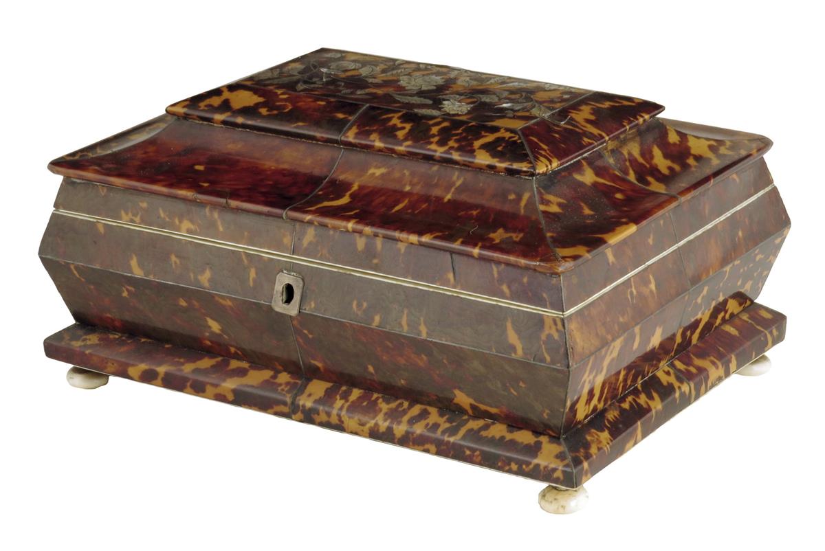 λ An early Victorian tortoiseshell sarcophagus shaped sewing box
