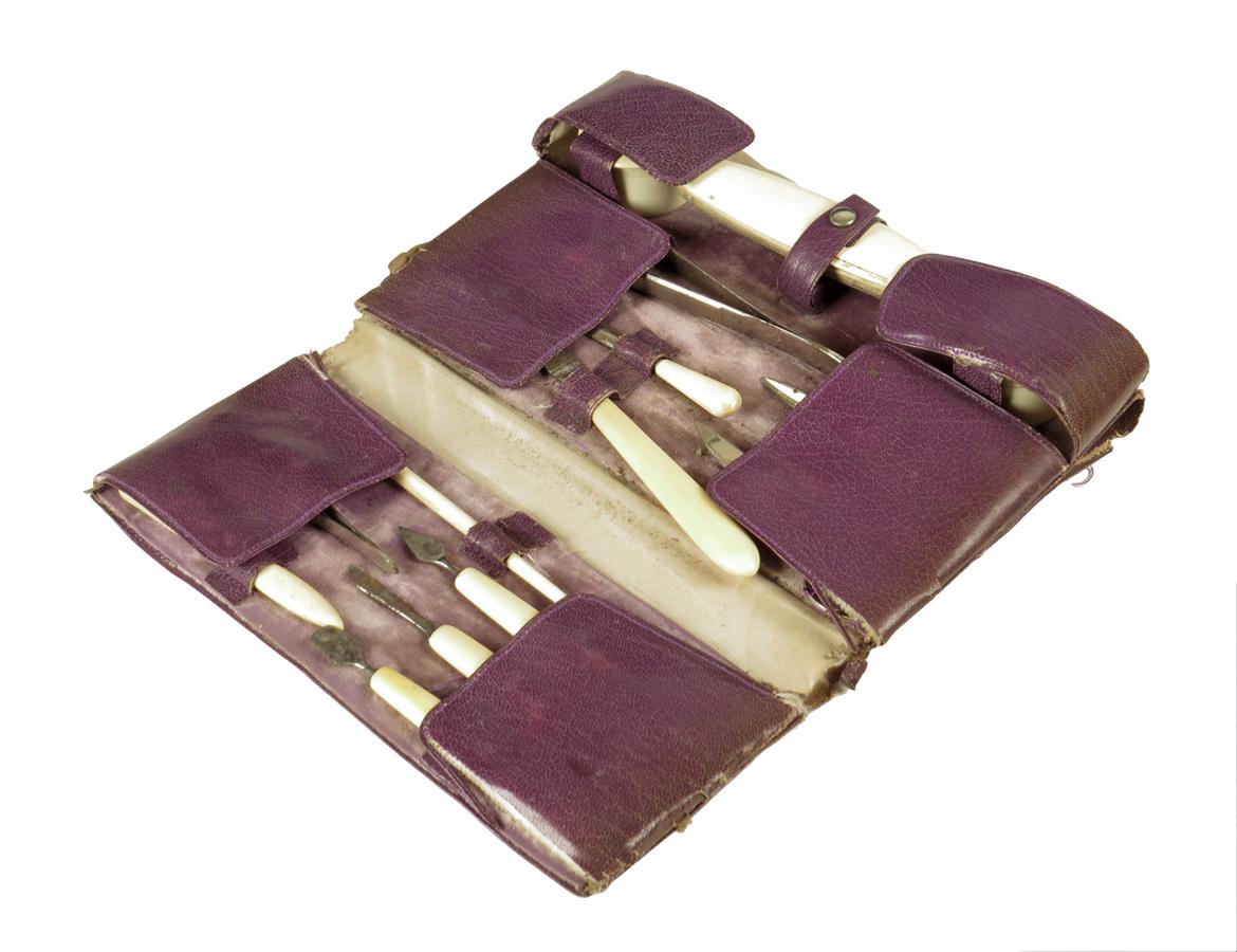 λ An early 20th century purple leather manicure set, the interior with two ivory lidded pots, a buffer, tweezers, scissors and other utensils, 22cm wide.