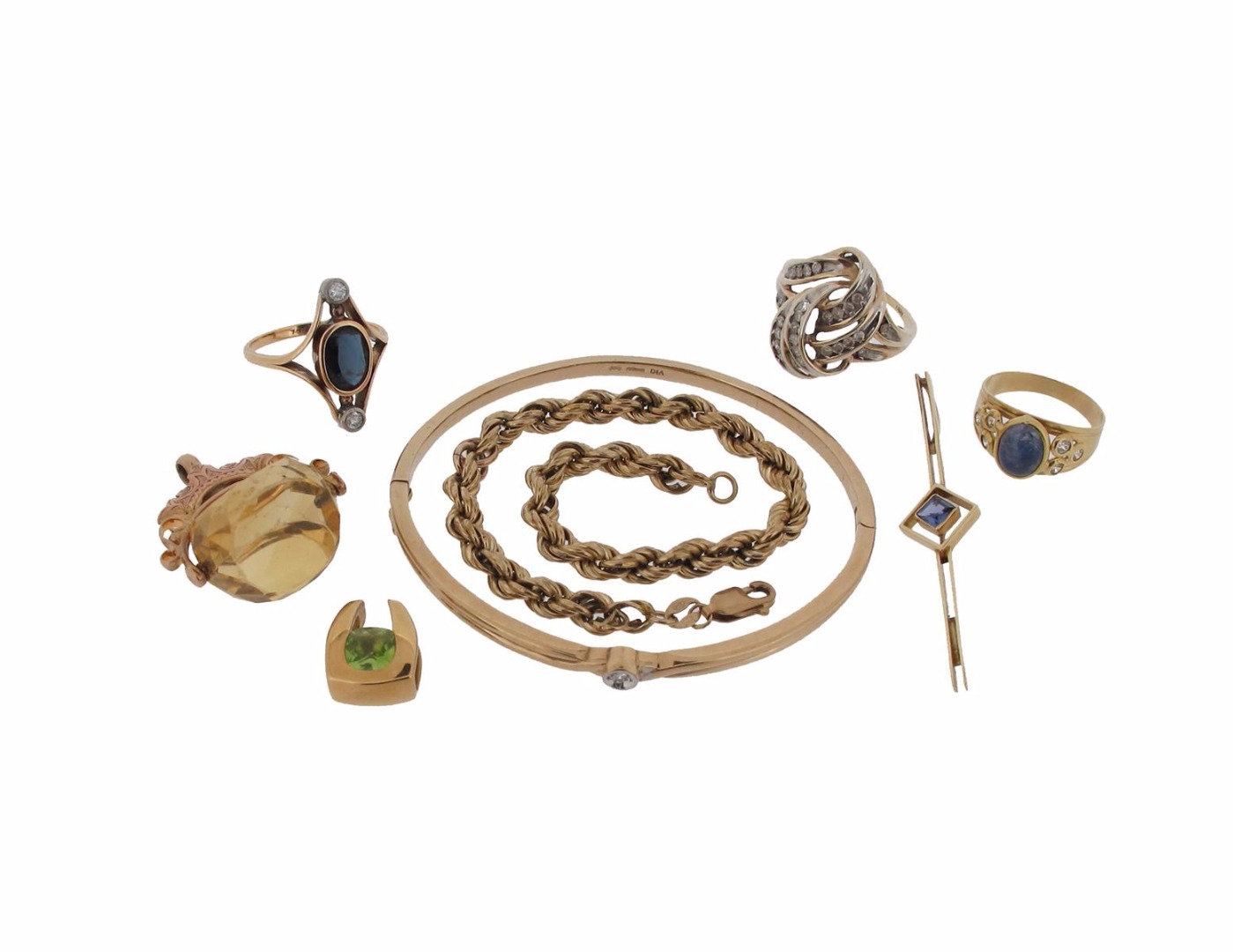 Assorted jewellery. Including a diamond set 9ct gold hinged bangle. Cased. A 9ct yellow gold rope link bracelet, 4.1g, 19cm. A cabochon sapphire ring with six shoulder stones,