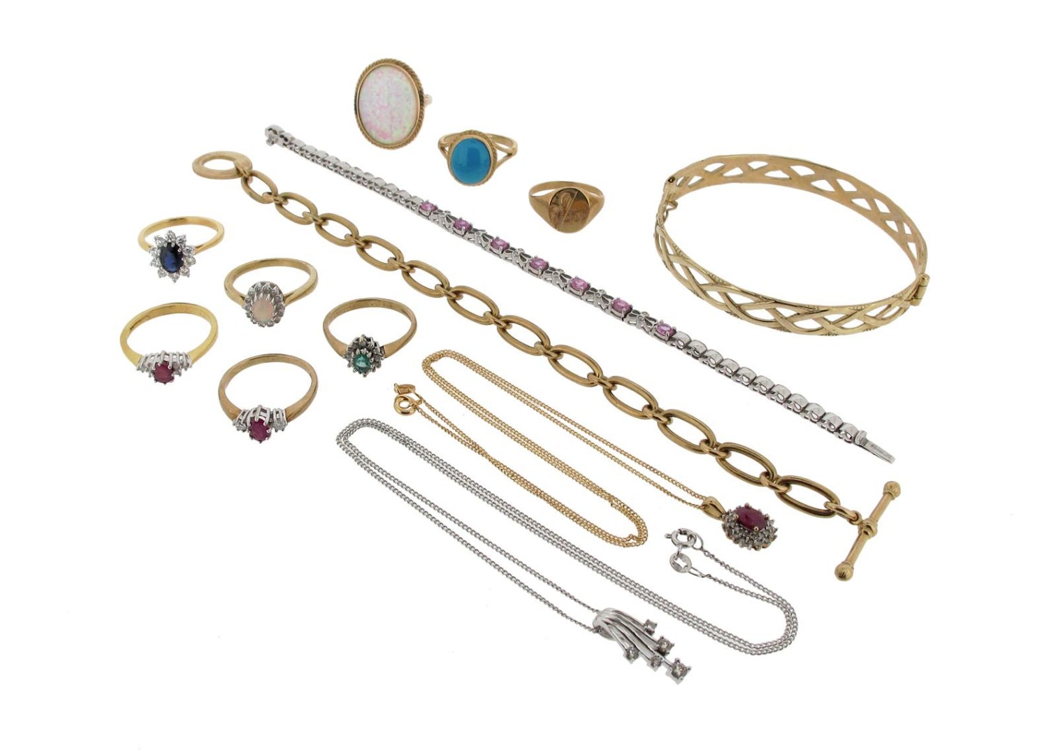 Assorted jewellery, including a diamond and sapphire set 18ct gold cluster ring and seven further plain and stone-set gold rings. A ruby and diamond cluster pendant set in 9ct yellow gold and a diamond-set 9ct white gold pendant, both with fine-link gold chains. A 9ct white gold bracelet set with diamonds and pink stones and a 9ct yellow gold chain link bracelet. A 9ct yellow gold bangle.