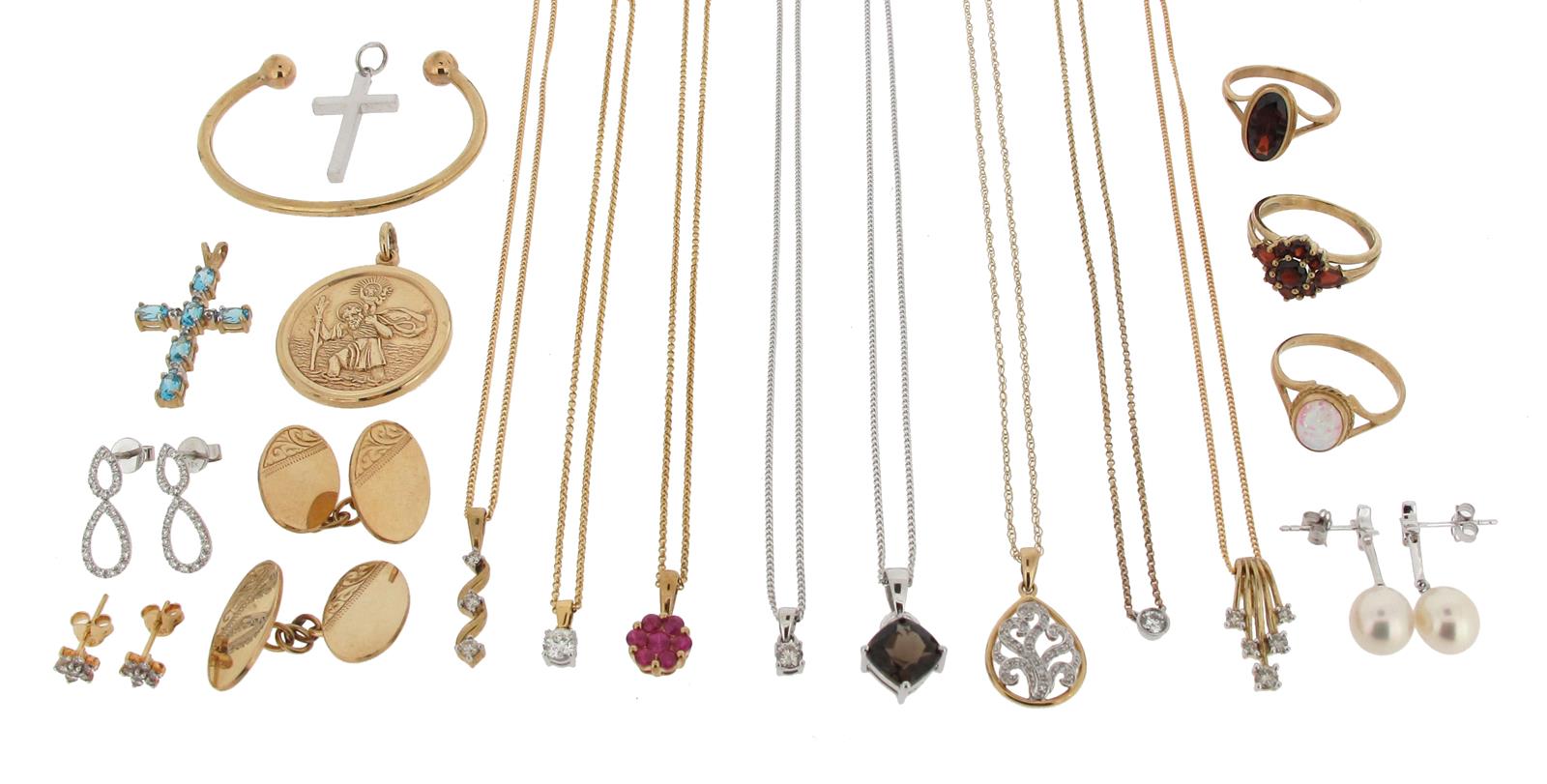 Assorted jewellery, including three 9ct yellow gold rings set with coloured stones. A 9ct yellow gold child's bracelet. A pair of white gold cultured pearl drop earrings, a pair of diamond cluster earrings and a further pair of diamond earrings. Six diamond pendants set in gold and two other pendants set with coloured stones. Two 9ct gold cross pendants and a 9ct gold St. Christopher pendant. A pair of 9ct gold cufflinks.