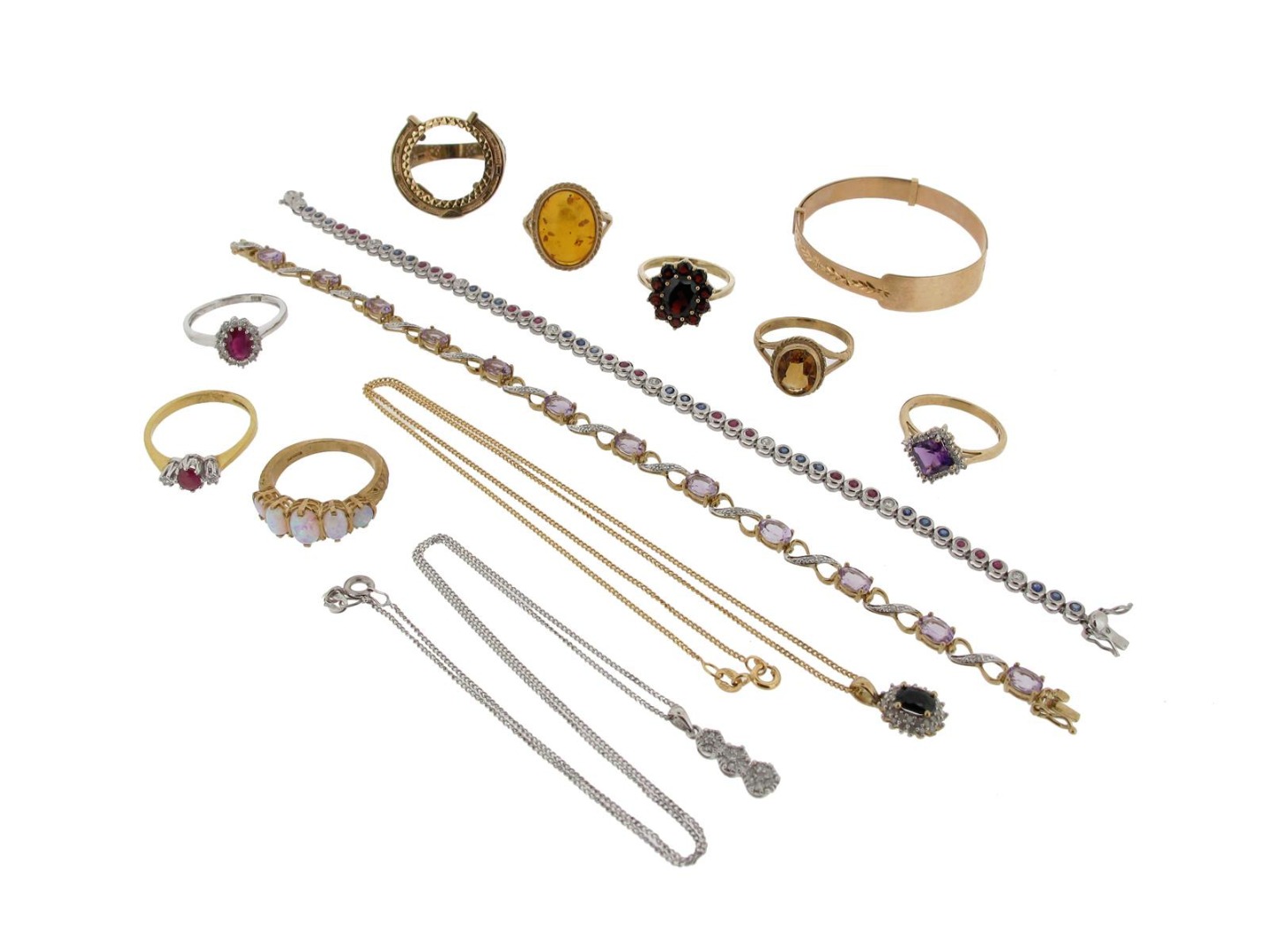Assorted jewellery, including a 9ct yellow gold child's bangle. Seven coloured stone gold rings. A yellow gold bracelet set with diamonds and amethysts and a white metal line bracelet set with alternating sapphires, rubies and diamonds. A 9ct yellow gold pendant set with diamonds and coloured stones and a 9ct white gold diamond pendant, both with gold fine link chains.