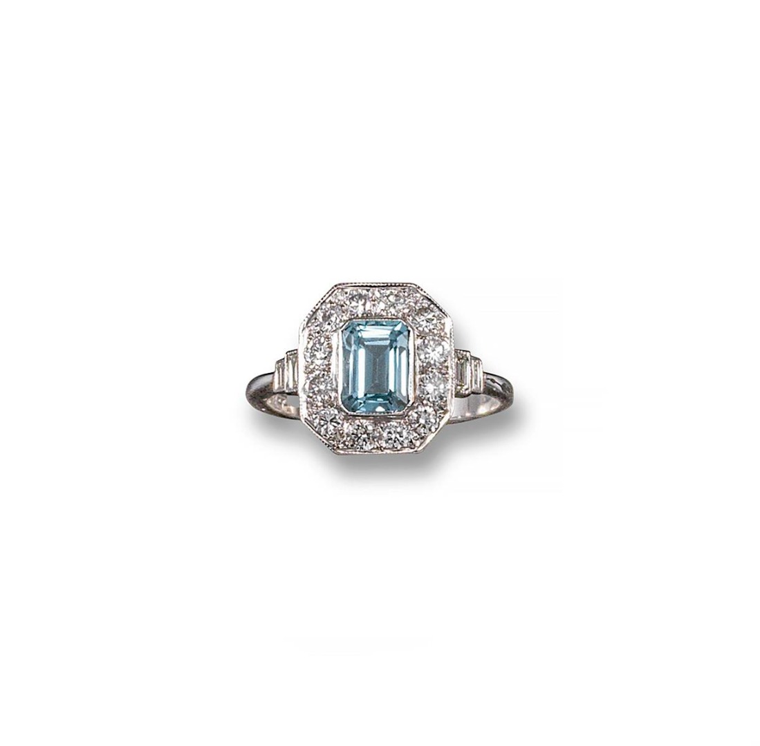 An aquamarine and diamond cluster ring, the emerald-cut aquamarine is set within a surround of circular-cut diamonds and baguette-shaped diamonds in white gold. Size O.