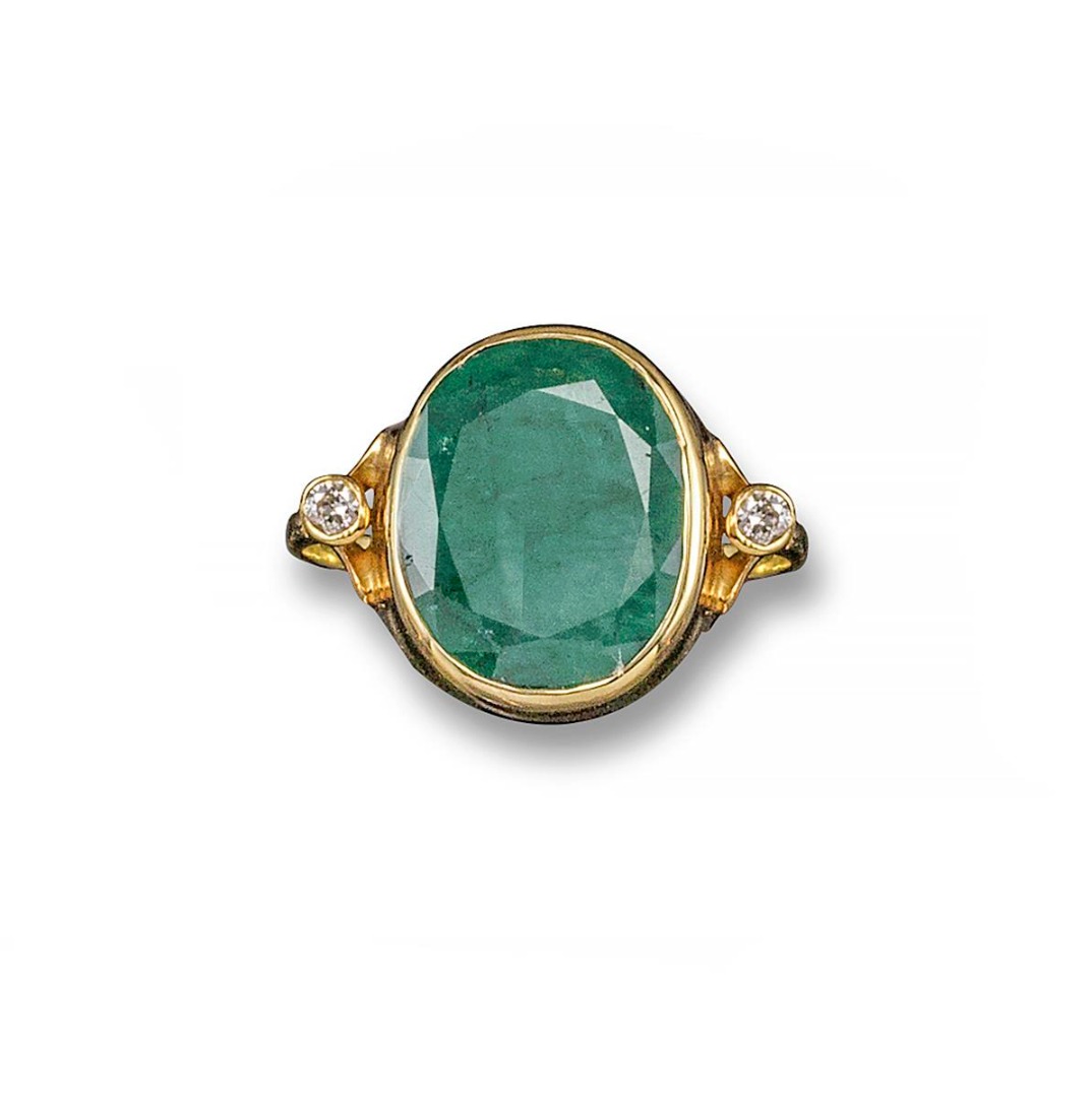 An emerald and diamond ring, the large emerald is rub-over set with a circular-cut diamond to each shoulder in yellow gold. Size P 1/2.