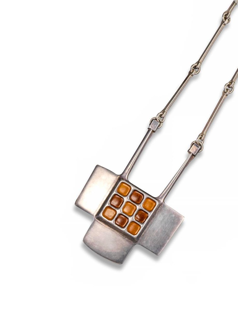 A silver Modernist necklace by David Anderson, of stylised geometric form, the central square panel applied with a chequerboard brown enamel pattern. Marked D-A to reverse and Norway INV.B.S.0. On a silver square bar link neck chain. 56cm long.