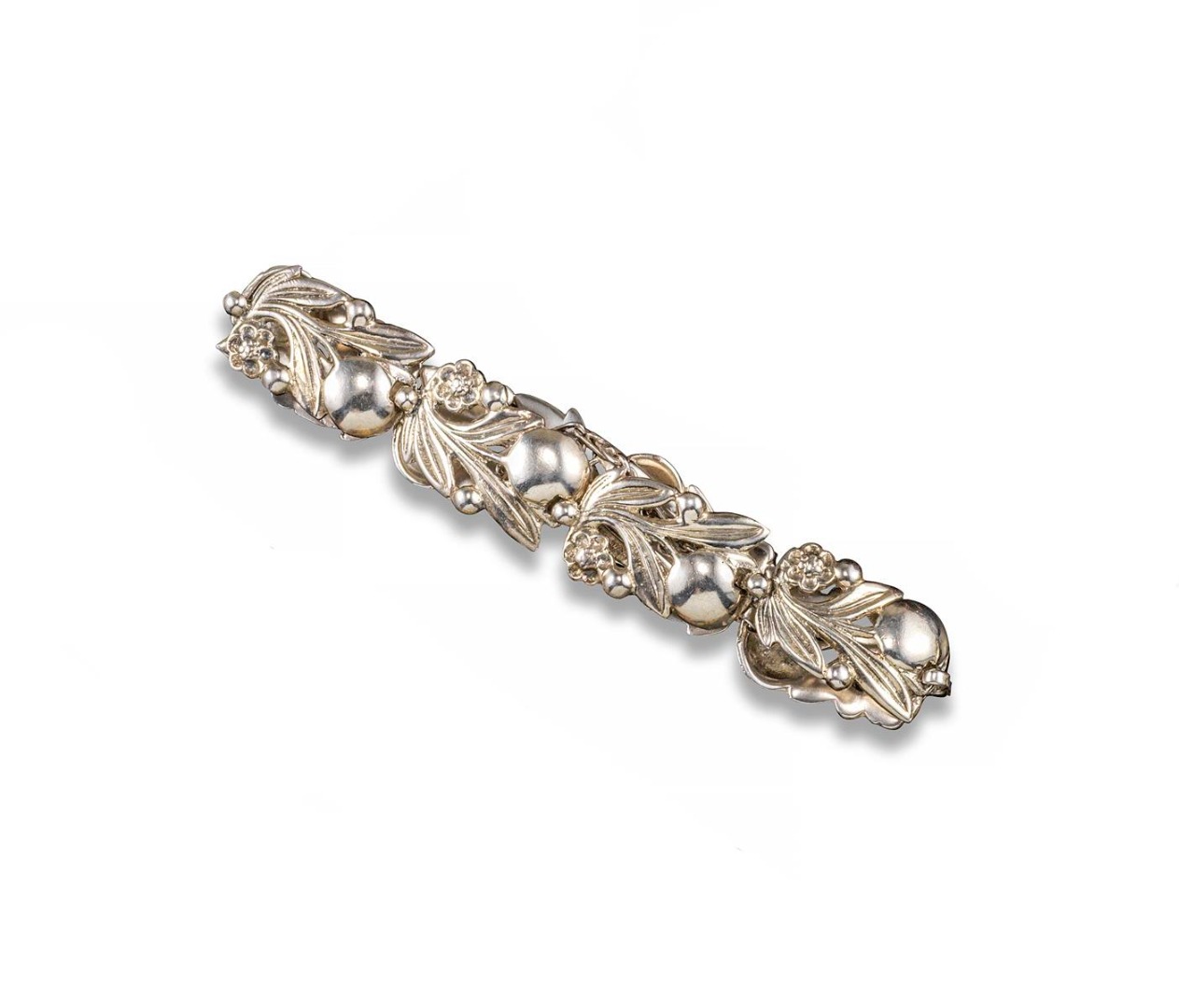An Arts and Crafts silver bracelet by Bernard Instone, designed as rectangular foliate panels. Marked B.I. 19cm long.