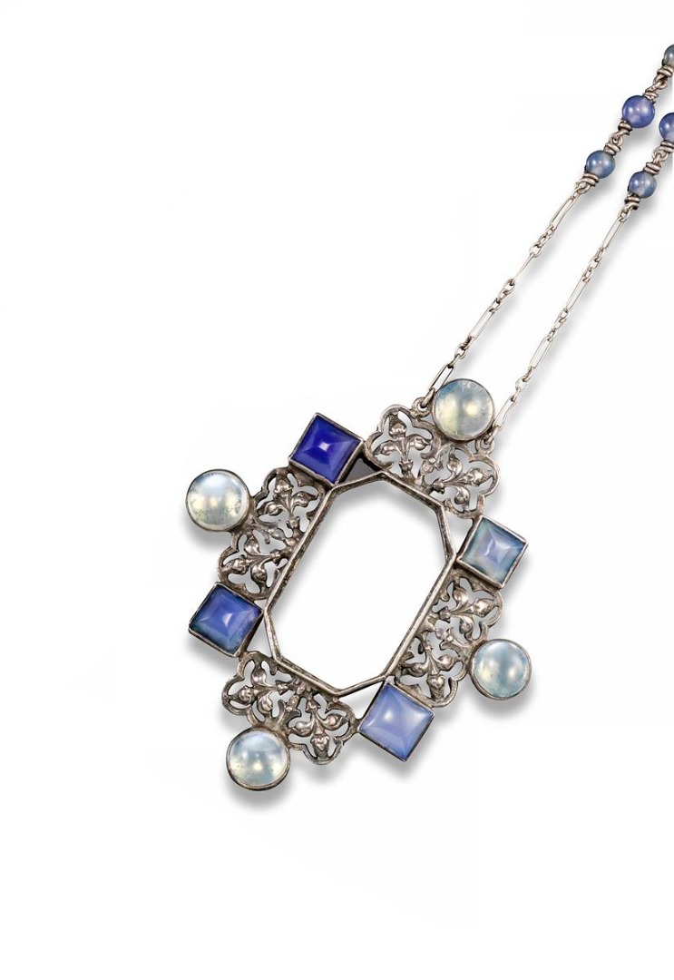 An Arts and crafts silver pendant in the Sybil Dunlop style, the central plaque (missing) is set within a surround of cabochon moonstones and dyed chalcedony within silver fleur de lys panels, on fine link silver chain set with blue chalcedony beads. The chain 66cm long.