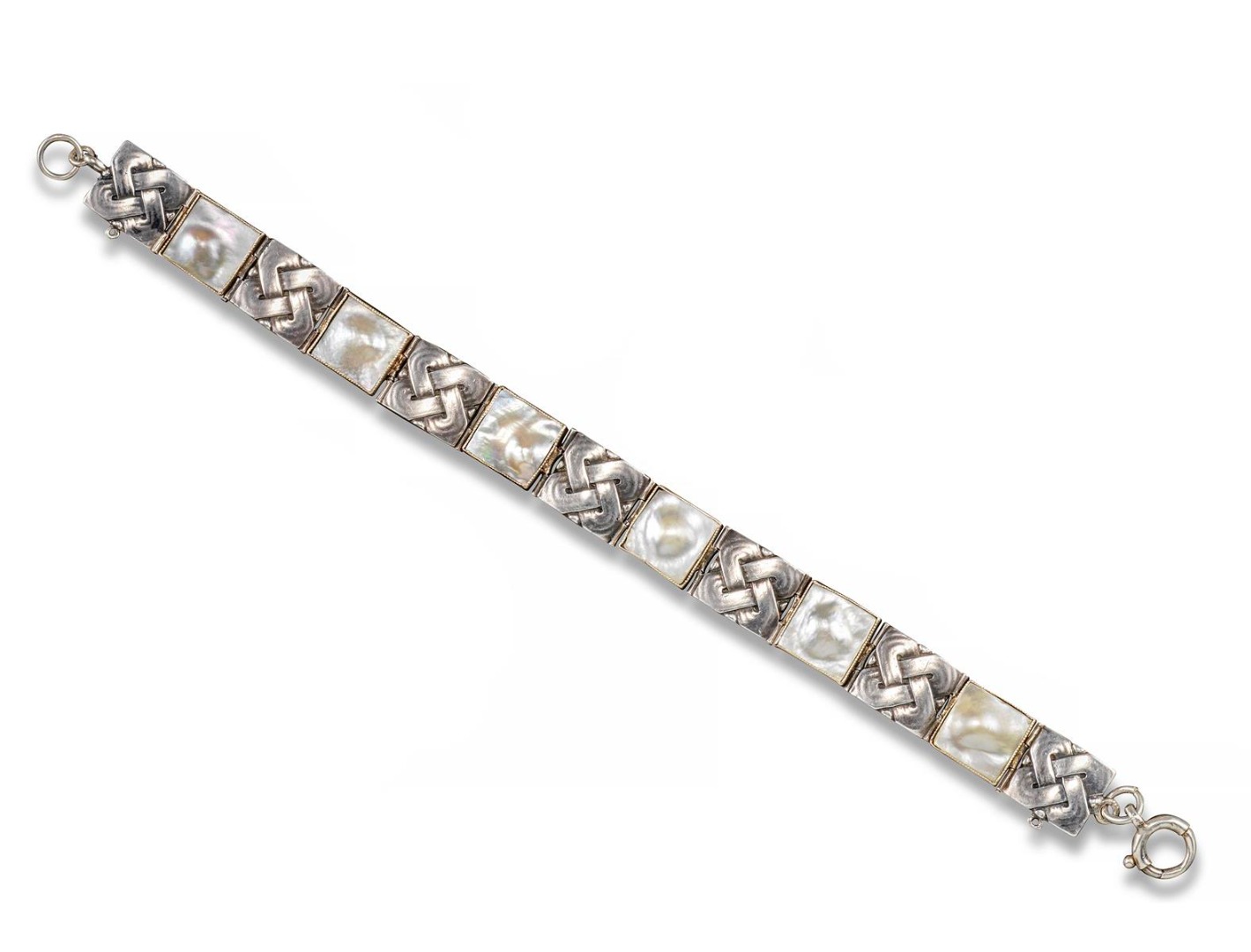 An early 20th century Jugendstil bracelet by Murrle Bennett & Co., the geometric pattern to the square silver panels alternately mounted with square blister pearl sections. Signed in monogram and 950. 17.2cm.