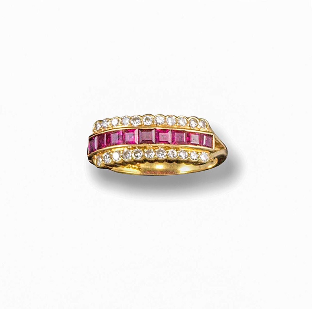 A ruby and diamond three row ring, the central line of calibre-cut rubies set within two lines of circular-cut diamonds in yellow gold. Size M 1/2.
