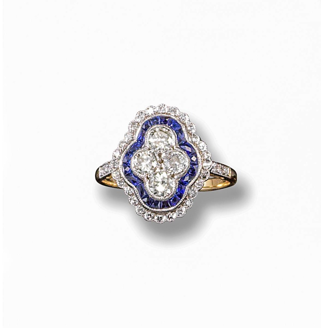 A sapphire and diamond quarterfoil ring, set with four central circular-cut diamonds within borders of French-cut sapphire and diamonds in platinum and yellow gold. Size N 1/2.