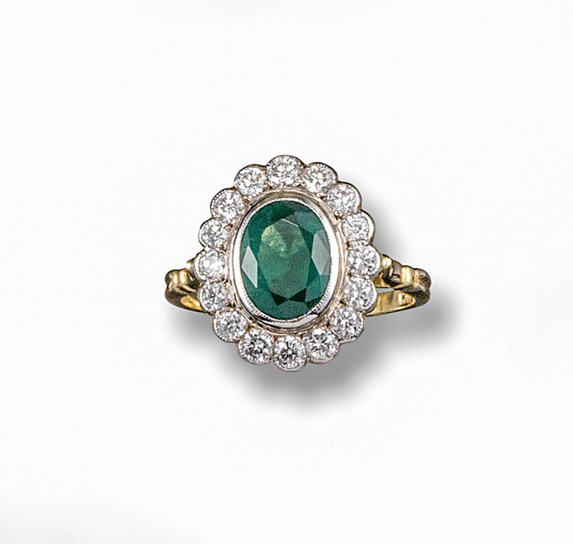 An emerald and diamond cluster ring, the oval-shaped emerald is set within a surround of circular-cut diamonds in platinum and white gold. Size O.