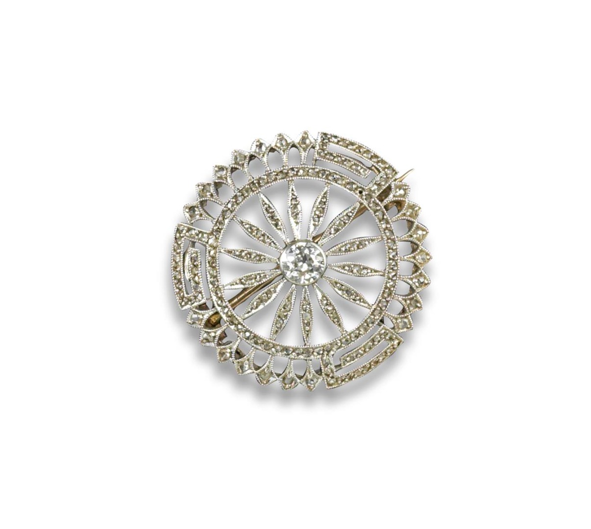 A diamond-set Edwardian openwork circular brooch, centred with an old circular-cut diamond to the rose-cut diamond flowerhead and stylised Greek keypattern border. 2.5cm wide. Fitted case by Carrington.