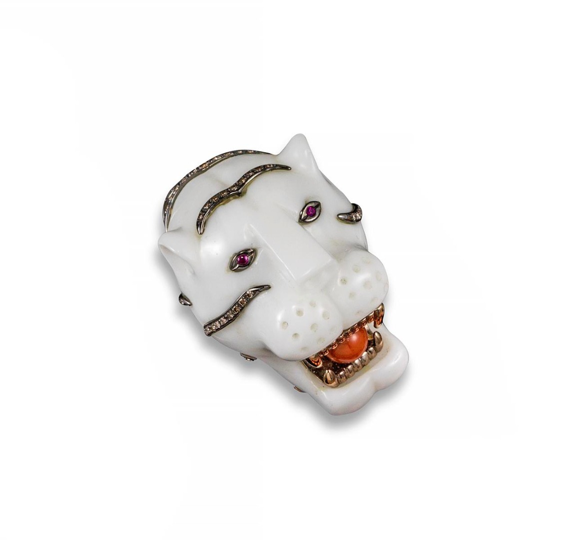 An unusual tiger's head ring, the carved white-stone ring clutching a coral ball in his gold teeth and with diamond-set stripes. Gold internal sleeve. Size N.