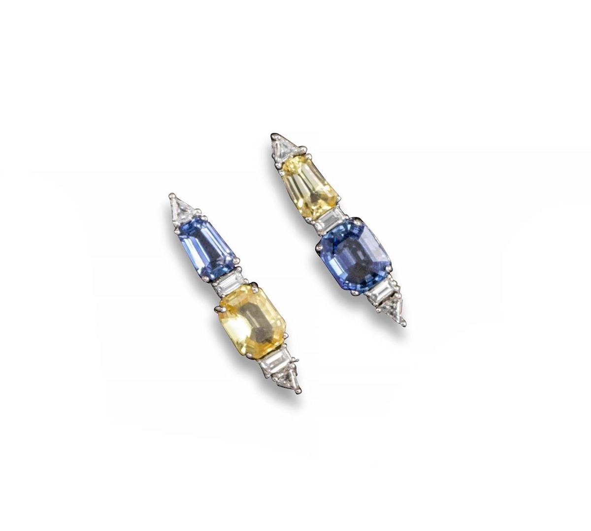 A pair of sapphire and diamond-set white gold drop earrings, each earring set with a yellow and a blue sapphire and with triangular and baguette-shaped diamonds. With a Cartier case.