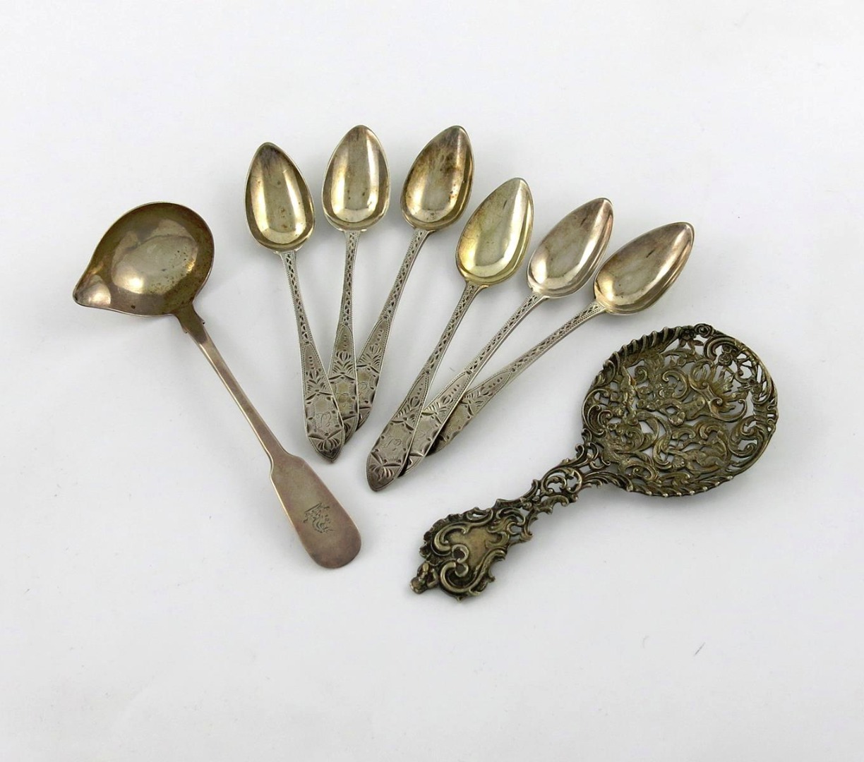 comprising: a set of six George III Scottish silver Celtic Point teaspoons, by W. P. Cunningham, with later engraved decoration, plus a pierced spoon, by William Comyns, London 1895, and an Irish Fiddle pattern toddy ladle with a lip, Dublin 1834, approx. weight 4.8oz. (8)
