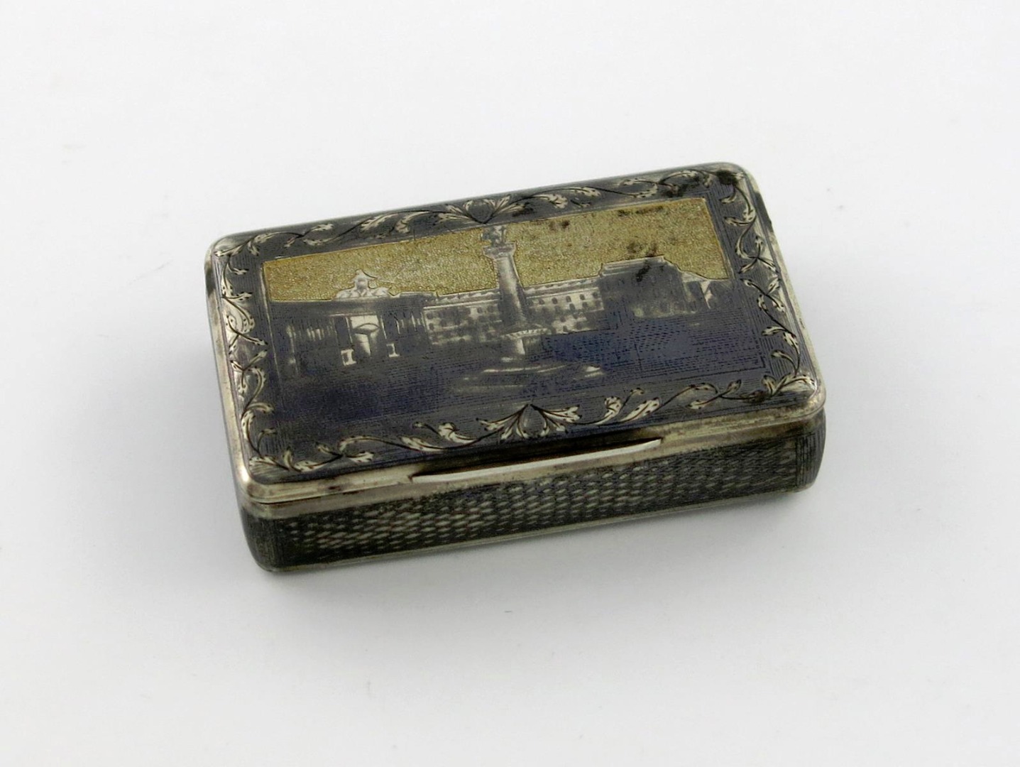 rectangular form, the hinged cover and base with architectural scenes, within foliate borders, niello work sides, length 6.4cm, approx. weight 2oz.