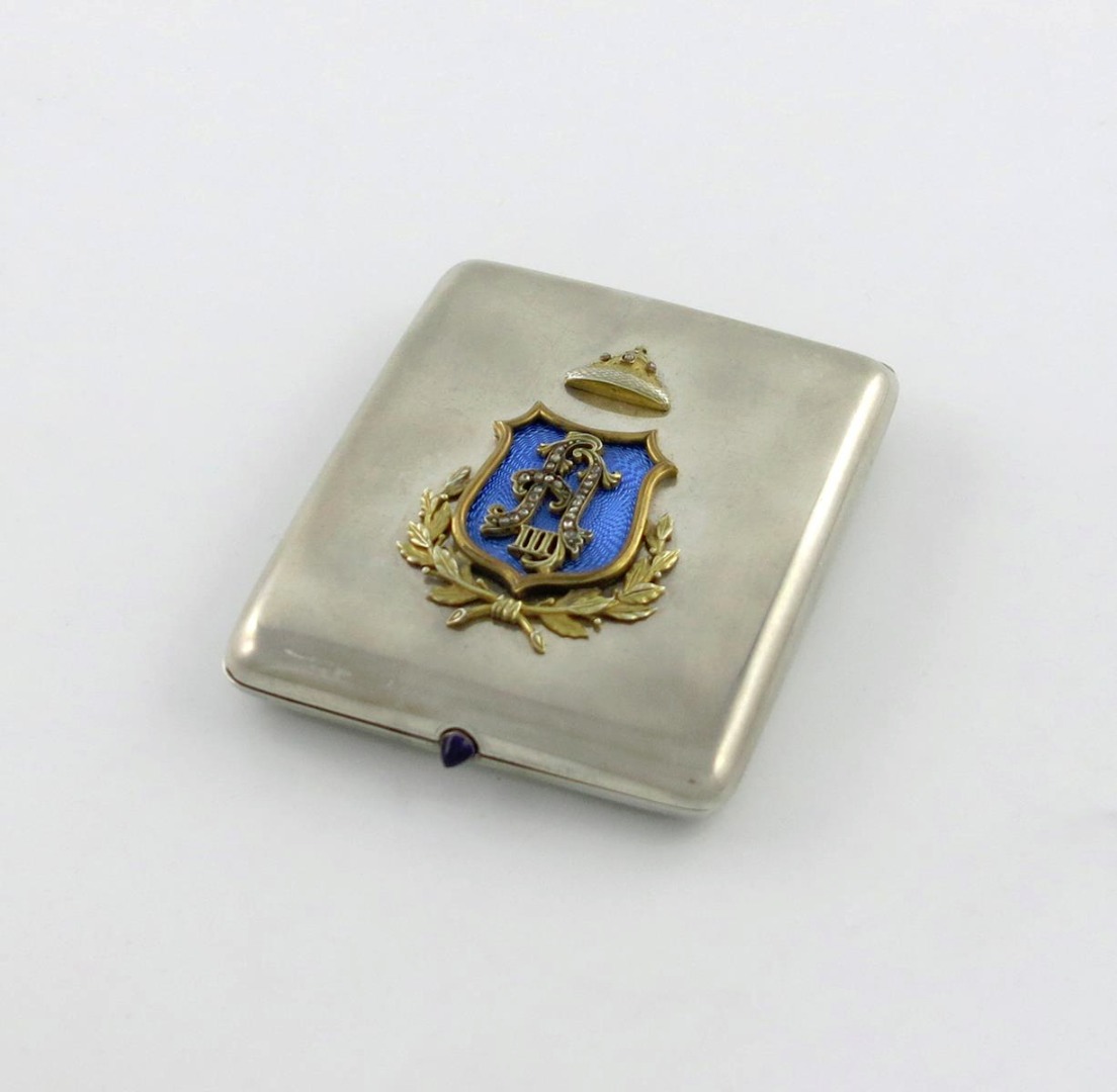 rectangular form, applied with a blue enamel cartouche with laurel leaf mounts and applied with a diamond set N and the numbers III, purple push button clasp, length 8.8cm, approx. weight 3oz.