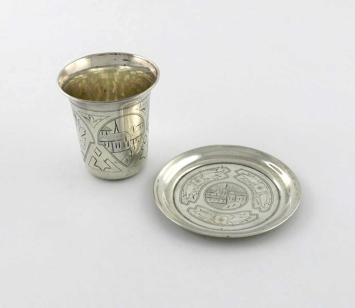 tapering circular form, engraved decoration, height 6.8cm, approx. weight 2.8oz. (2)