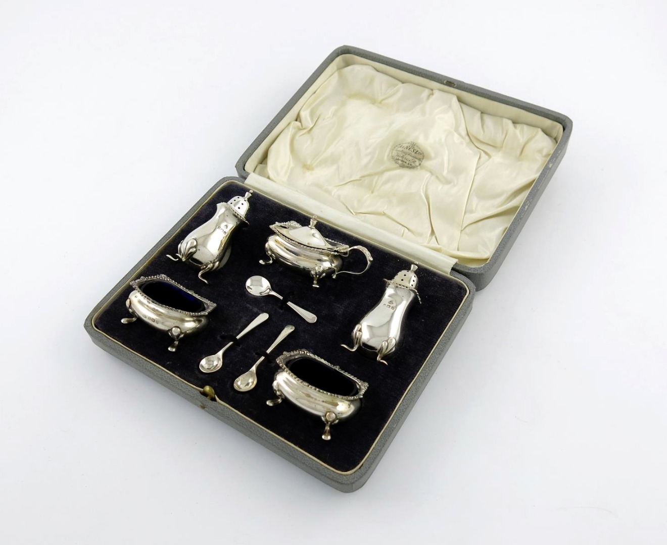 oblong bellied form, gadroon and shell borders, comprising: two salt cellars, two pepper pots and a mustard pot, with blue glass liners and with three spoons, in a fitted case, approx. weight 5.2oz.