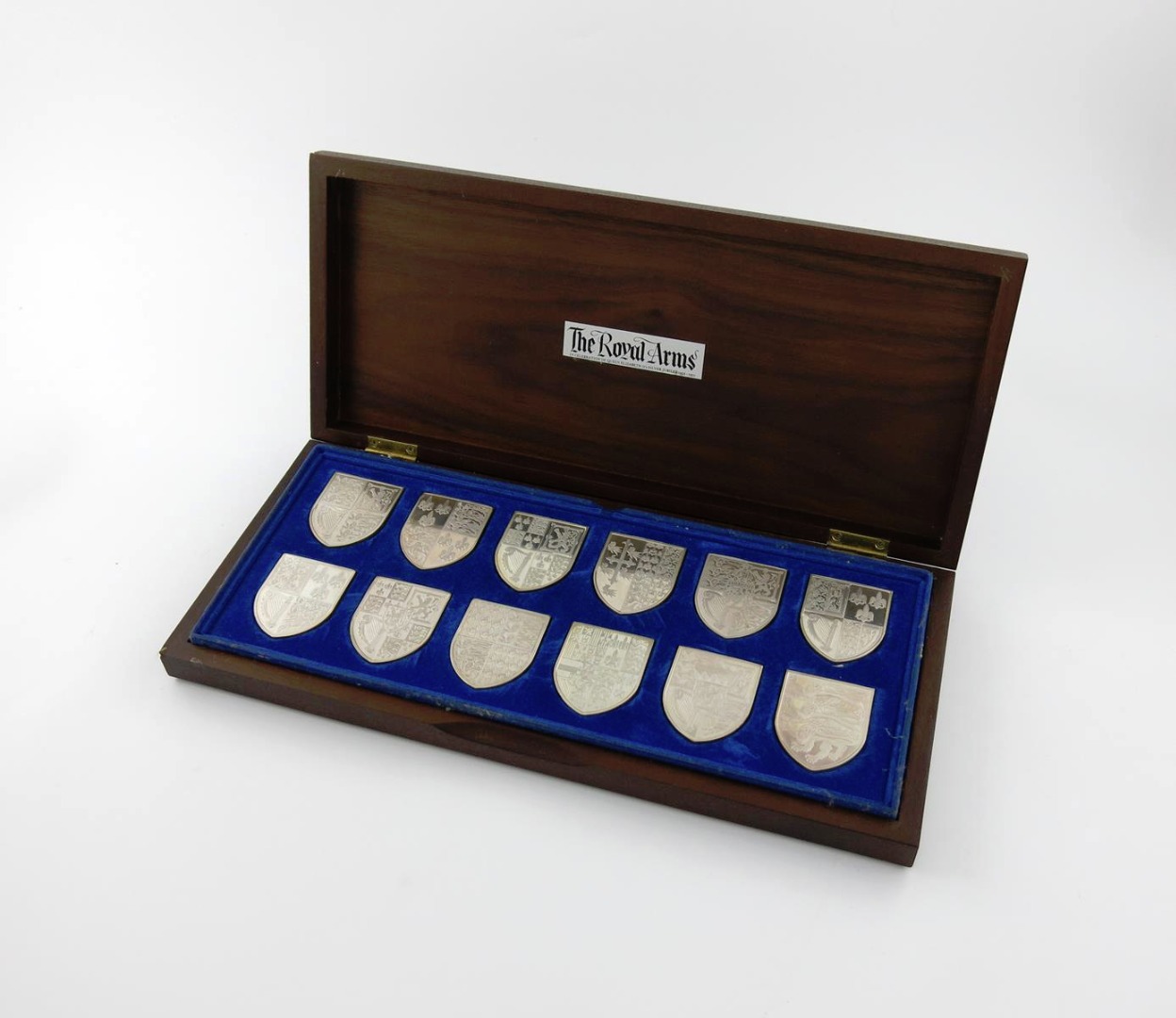 each shield displaying a Royal Arms, made in celebration of Queen Elizabeth II's Silver Jubilee, cased and with twelve certificates, approx. weight 18oz.