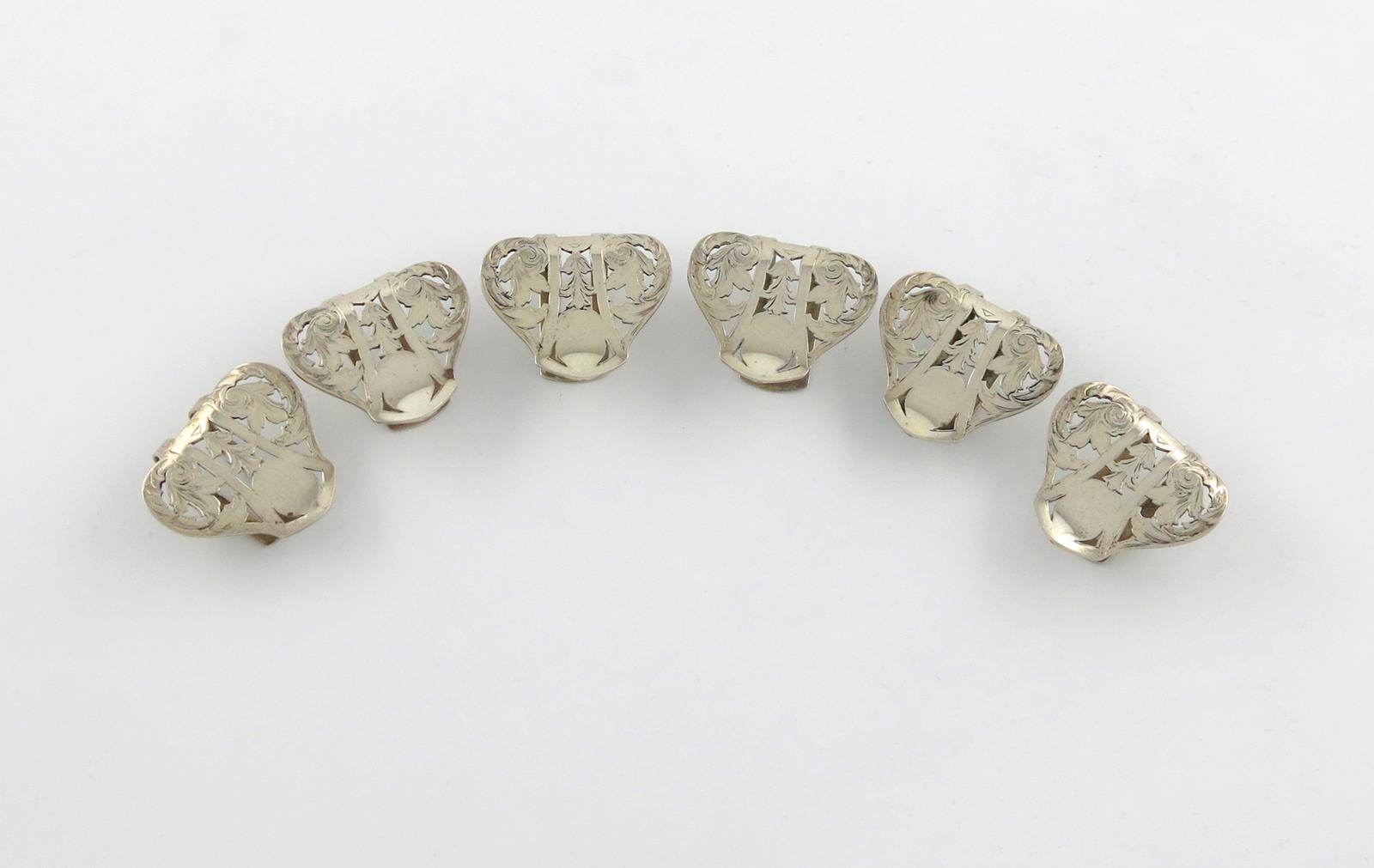 shaped form, pierced and engraved with foliate scroll decoration, length 3.9cm, approx. weight 2oz. (6)