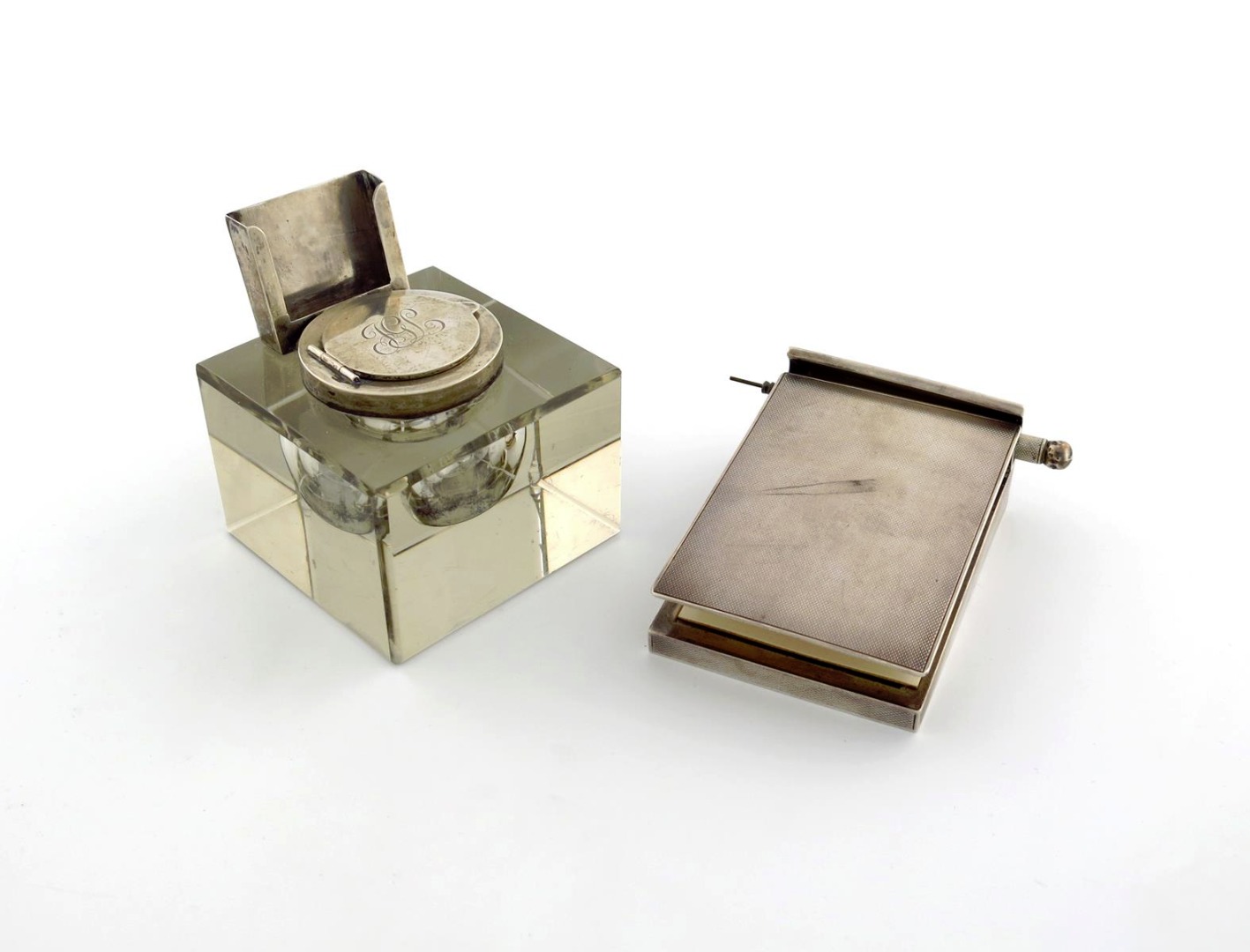 rectangular form, engine-turned decoration, the sprung hinged cover opens when the pencil is removed, plus a silver-mounted inkwell with a calendar holder, Birmingham 1909, square form, the hinged cover initialled, length 9cm. (3)