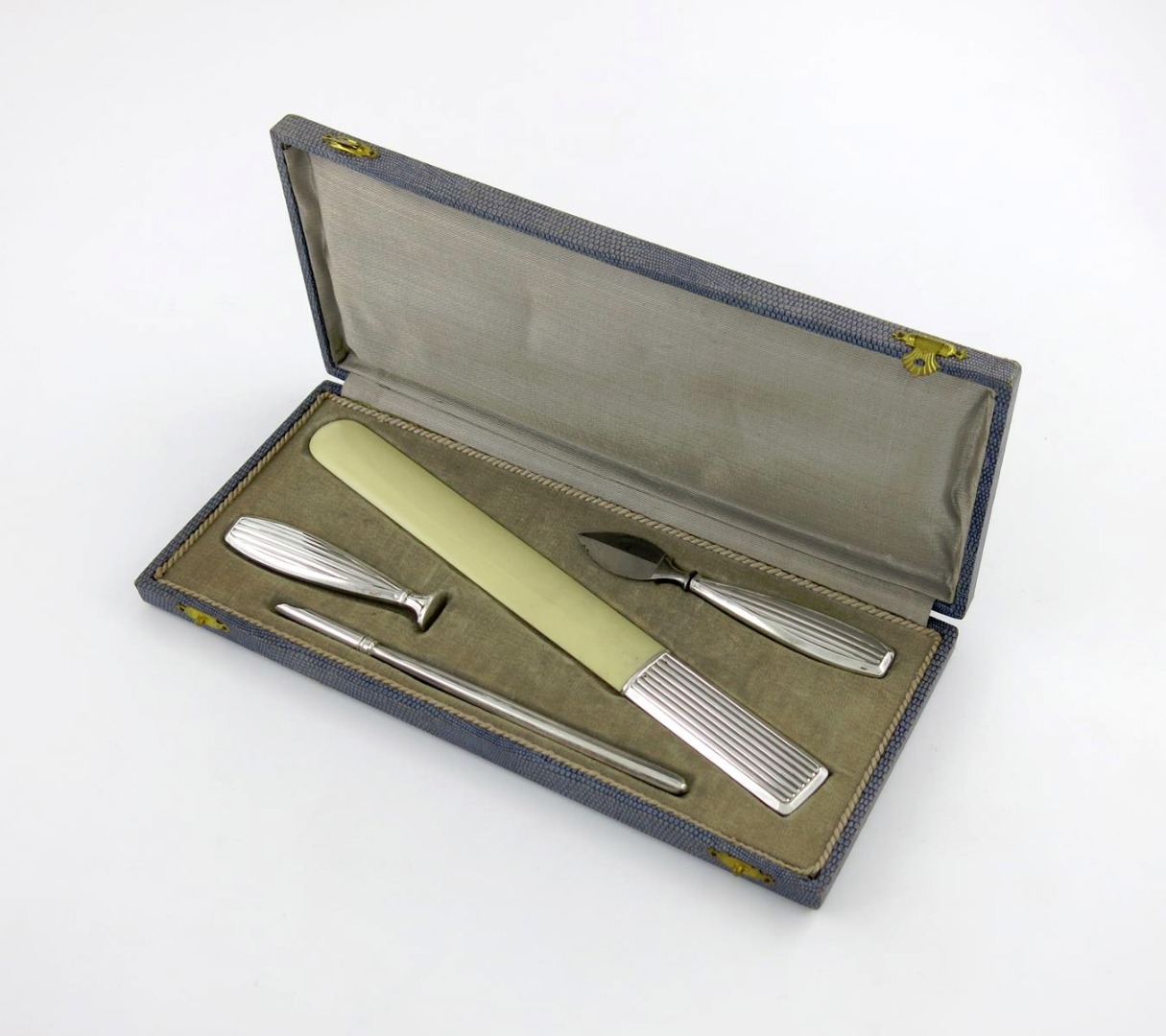 comprising: a page turner, a desk seal a pen and a knife, fluted handles ivory blade, in a fitted case, length of turner 25cm.