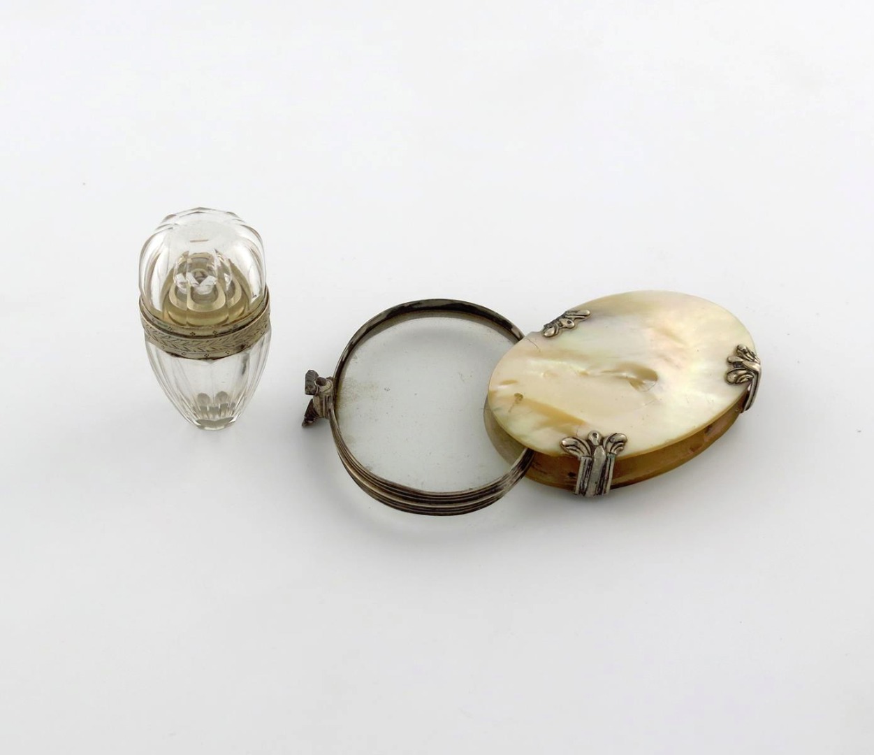 oval form, fluted mounts, hinge a.f, plus a silver-mounted glass scent bottle, of panelled circular tapering form, height 6.5cm. (2)