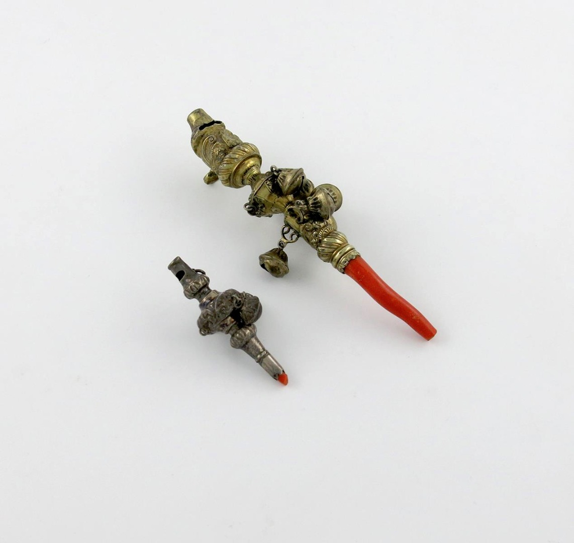 baluster form, embossed foliate and fluted decoration, with a ring attachment and with a coral teether, length 16.5cm, plus a Victorian baby's rattle, by George Unite. (2)