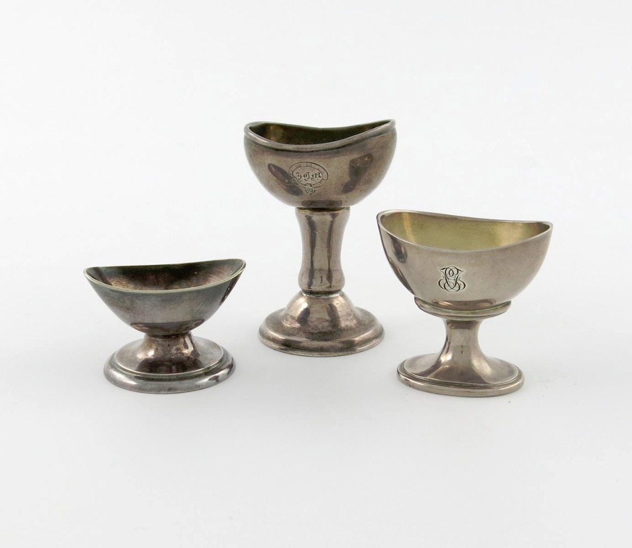 oval form, on a raised oval base, initialled, plus an unmarked eye bath and an electroplated eye bath, heights 4.5cm, 6.4cm, and 3cm. (3)