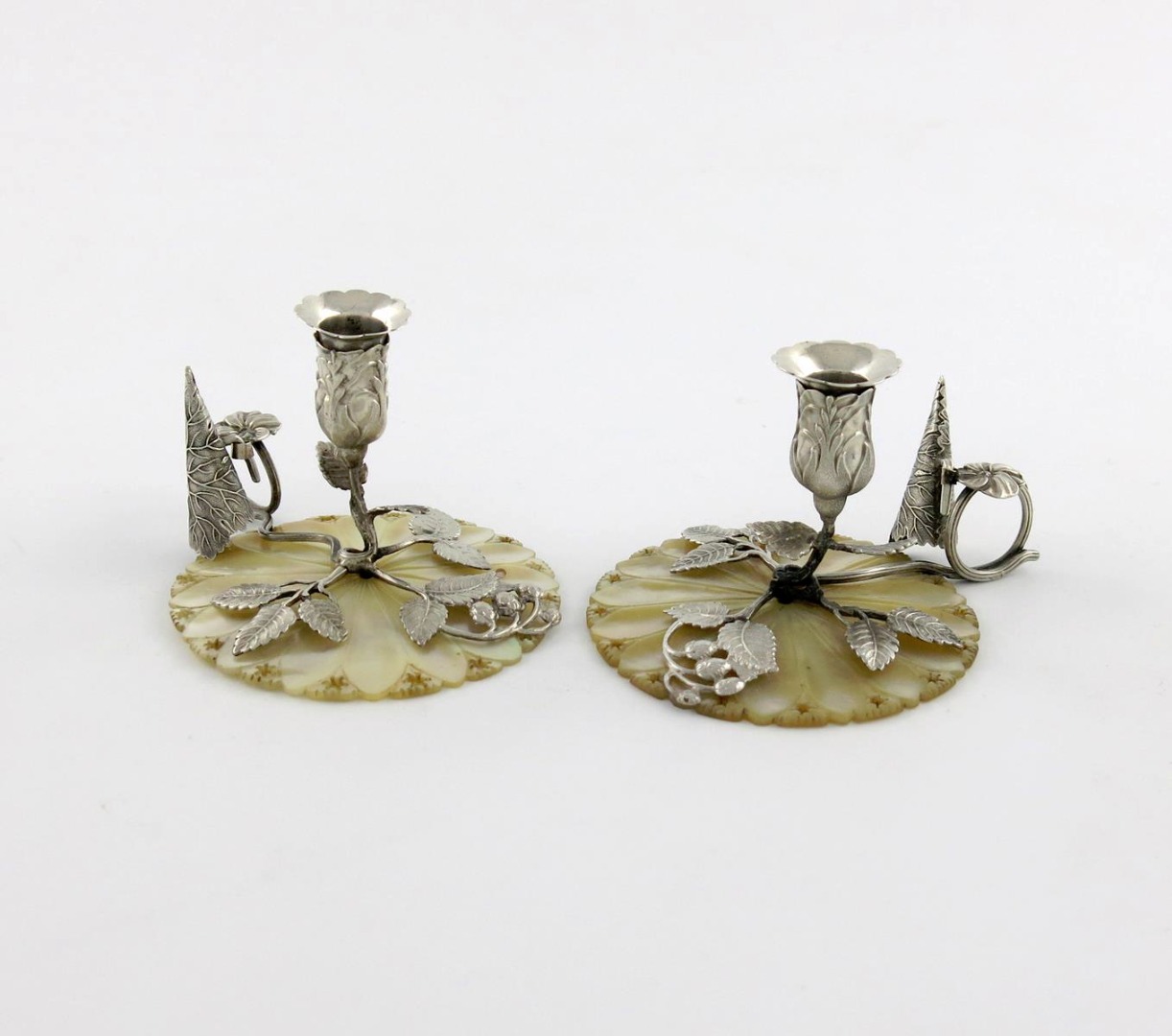 A pair of 19th century silver and mother-of-pearl miniature naturalistic chamber sticks