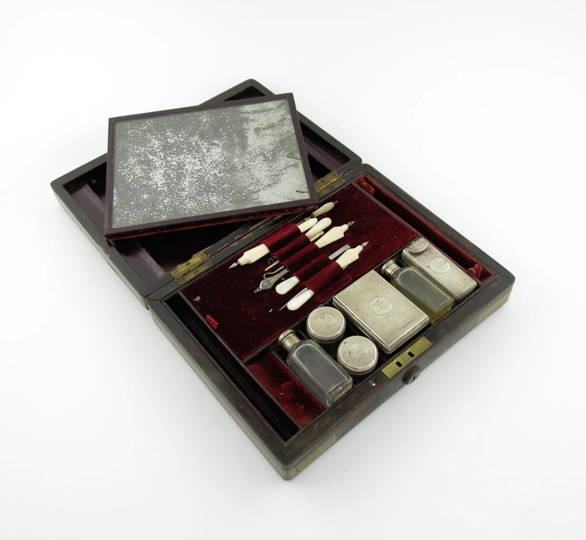 comprising: six glass dressing table jars, with engine turned covers, crested, eight mother-of-pearl and ivory handled implements, the interior cover fitted with a mirror, in a brass bound wooden case.