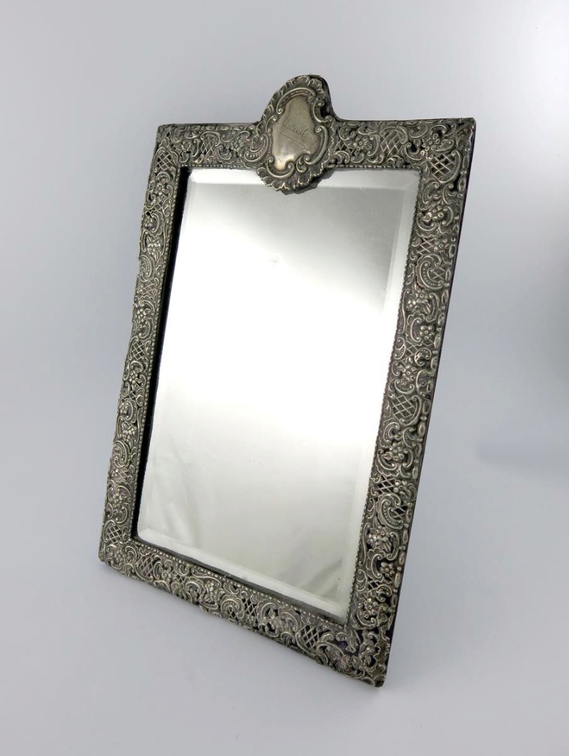 upright rectangular form, pierced and embossed foliate scroll decoration and trellis work, central cartouche, inscribed, velvet easel back, height 49cm.