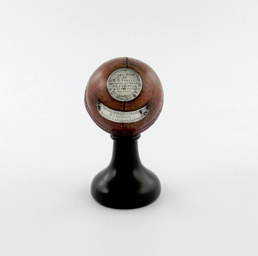 mounted with two plaques, inscribed ' Beckenham Cricket Club, Presented to H.B. Street for taking 27 wickets for an average of 6.22 per wicket in the first Beckenham Cricket Week, July 1893' and the other plaque inscribed '5 v Oxford University Authentics, 13 v Incogniti, 9 v H.D.G Leveson Gowers XI', on a later stand.