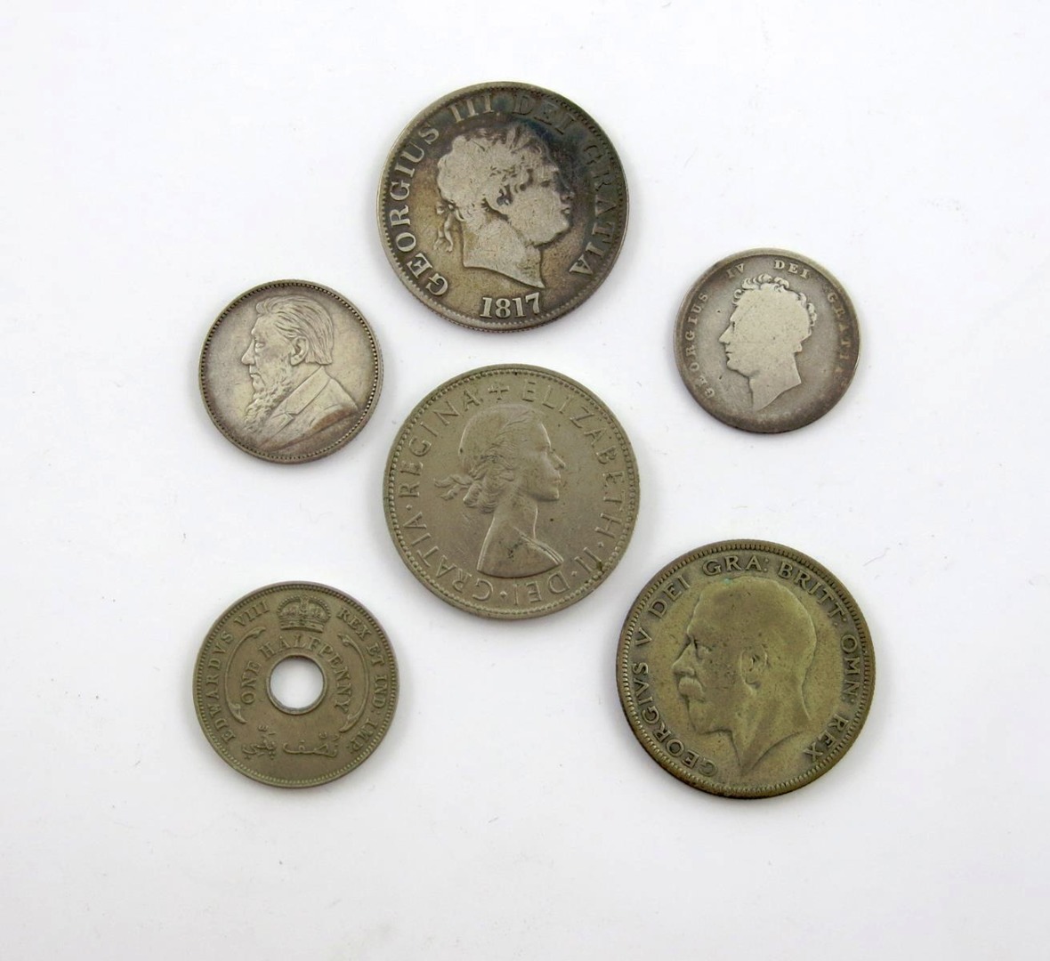 Charles II, Crown, 1676; others, 1695, 1818, 1845, 1889 (2), 1935; 3-Shilling Token, 1814; contemporary forgery of a counterstamped Dollar; together with a mixed selection of British and world silver coinage; pre-'47 issues, etc., including a few better pieces. Varied state. (qty)