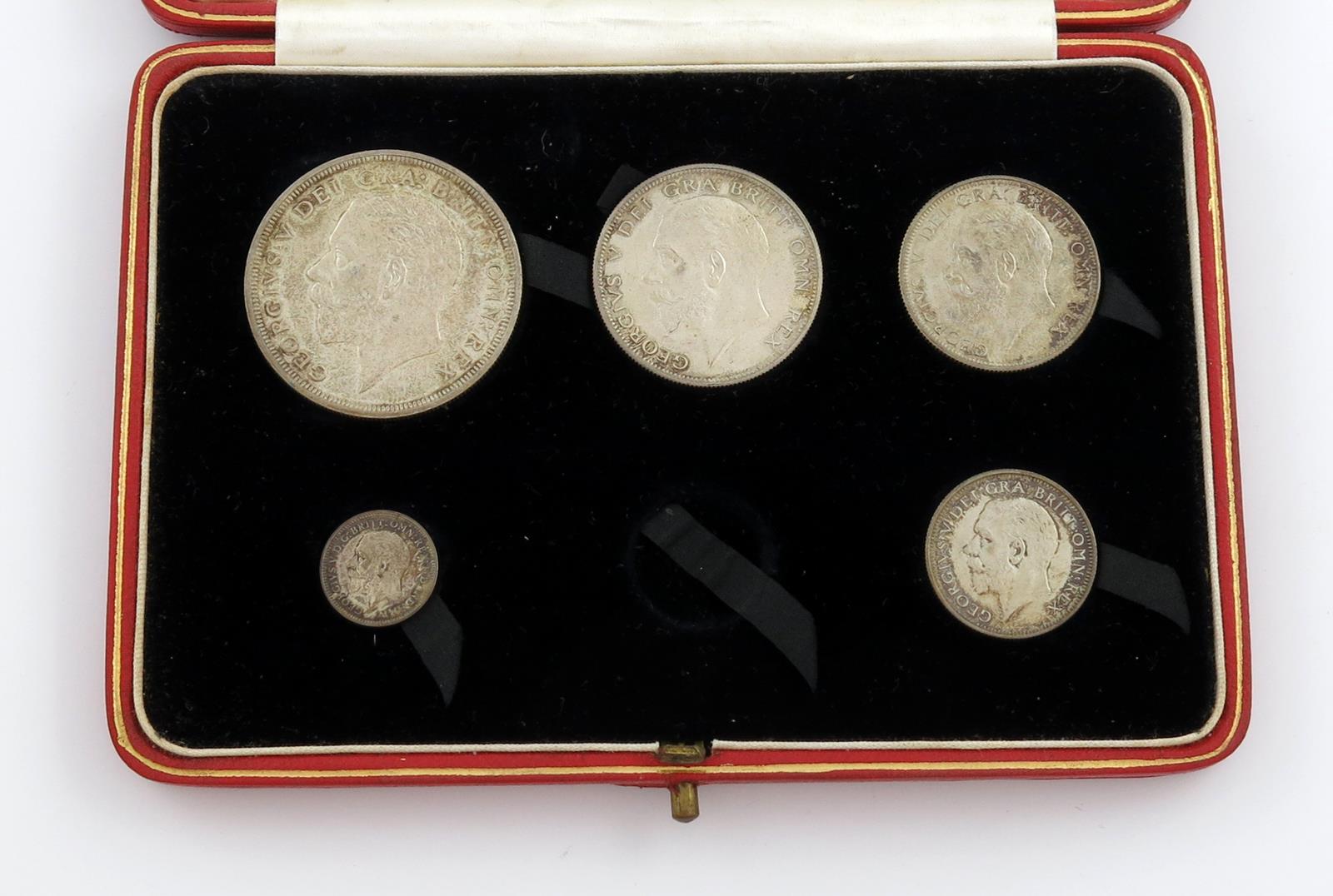 George V, Specimen Set of coins, 1927, comprising silver Crown to Threepence (Sixpence missing), in red leather case of issue. Extremely fine. (5)