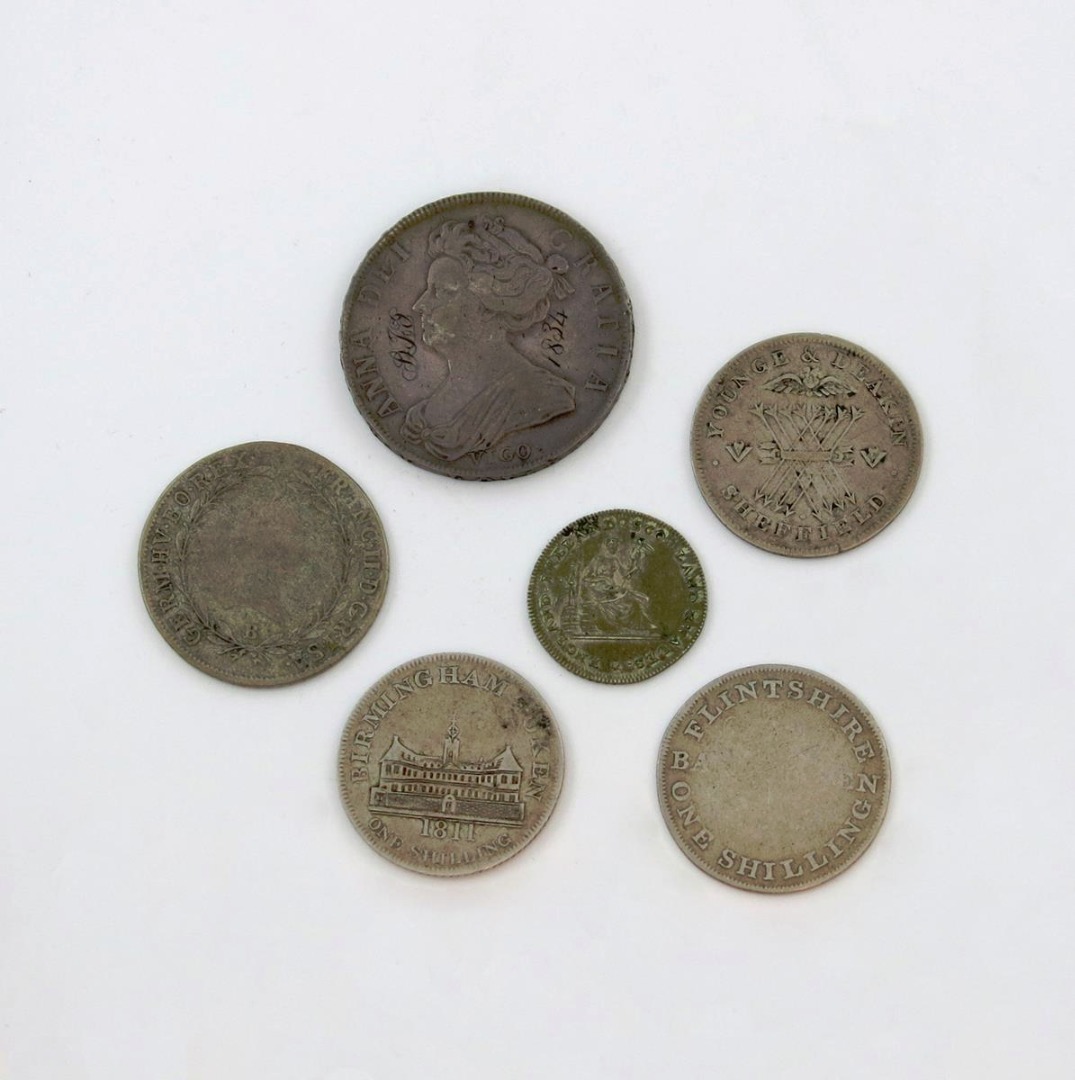Anne, Halfcrown, 1703, initials and date 1834 engraved either side of bust, very fine; Bank Token Shillings (3), fair; Sixpence, S. Lloyd, Bucklebsbury, 1811; good very fine; and another silver coin. (6)