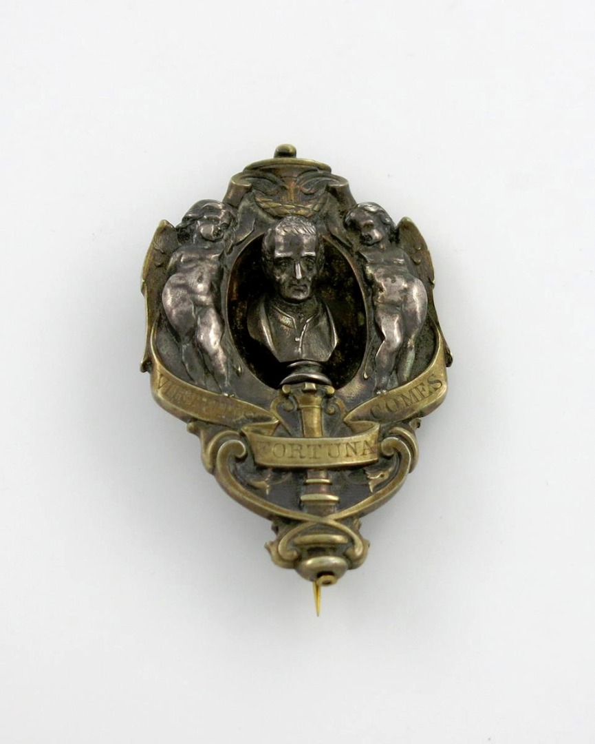 The Duke of Wellington, shaped oval silver and gilt Memorial Brooch, 1852, by Elkington, Mason & Co., three dimensional bust of Wellington within alcove, cherubs hold laurel wreath above, his motto below, VIRTUTIS FORTUNA COMES, 67 x 42.5mm (Eimer, Wellington - ). Very fine and very rare.