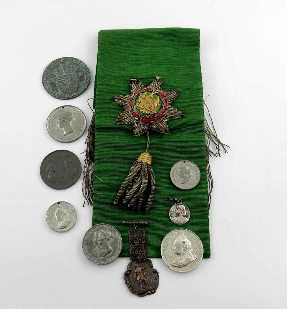 Ancient Order of Foresters, green sash with embroidered badge, 19th century, gilded badge; together with a good collection of white metal commemorative medallions, from Victoria onwards. Many very fine or better. (qty)