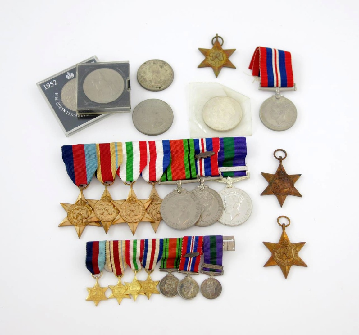 World War II, group of 7, 1939-45, Africa, Italy and France and Germany Stars, defence and War Medals, latter with MiD oak leaves; General Service Medal, G VI, clasp Palestine (1323 B, Const. L. Heath. Pal. Police), last perhaps replacement, brooch mounted, with dress miniatures; Group of four, attributed to Commander Philip Hadow, R.N., 1939-45, Atlantic and Africa Stars, War Medal; together with sundry coins. Medals extremely fine. (qty)