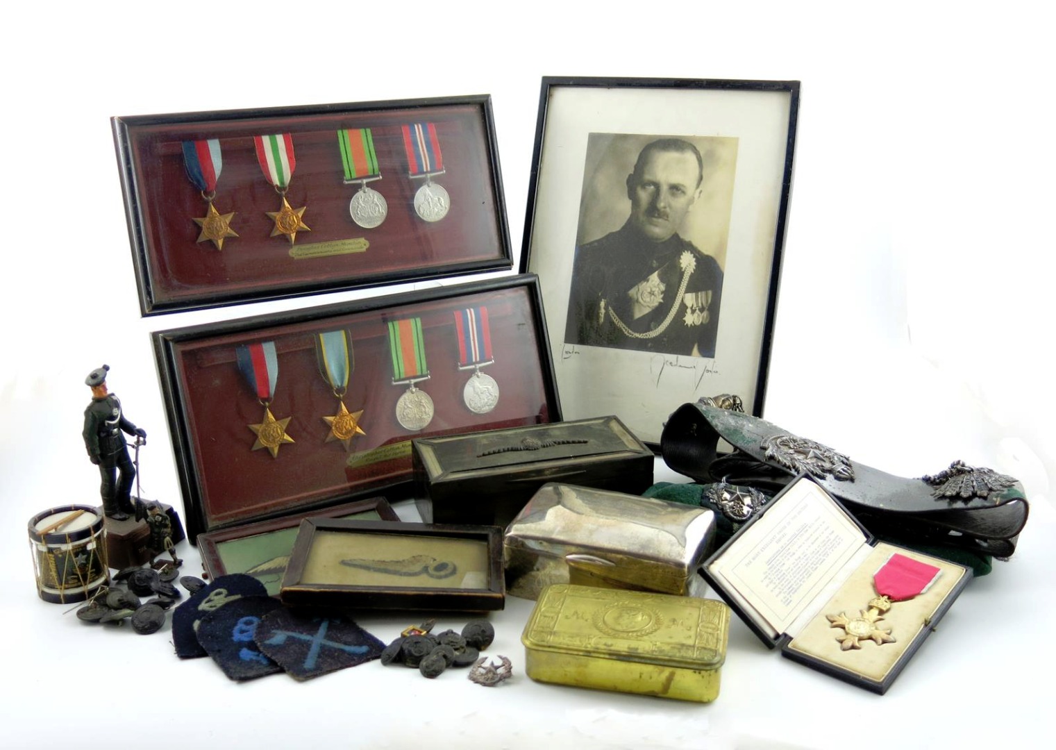 O.B.E., attributed to Major James Humphrey Cotton Minchin (1894-1966), their father, in case of issue, mint state. Sold with framed photograph of their father, Major James Humphrey Cotton Minchin (1894-1966), in uniform and wearing silver-mounted leather shoulder belt of the Scottish Rifles; silver-mounted leather shoulder belt of the Scottish Rifles, as in photograph; silver cigarette box 'Captain J H C Minchin from the Officers Eastern Group Command, Royal Flying Corps, 17th May 1917"; silver-plated cigarette box, RFC wings on lid; RFC cloth wings and half-wing (separate frames); Princess Mary's Christmas tin (with tobacco intact); Douglas Cotton Minchin's green beret; and letters relating to the medals.