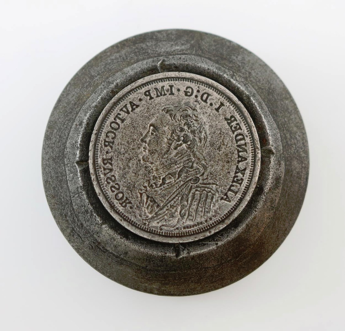 Russia, Alexander I (1777-1801-1825), Pattern Rouble, 1804, the original obverse die, by Conrad Heinrich Küchler, his uniformed bust in intaglio, with high collar and Sash of Order, legend around, ALEXANDER I D:G IMP AVTOCR RVSSOR, 50 x 66mm (Pollard 29 (i); Diakov 293.1; Bitkin 691. Severin 2552; BDM VI, 396, illus), small alignment marks at compass points around 'coin'. Good fine, actual coin surface showing rust damage.