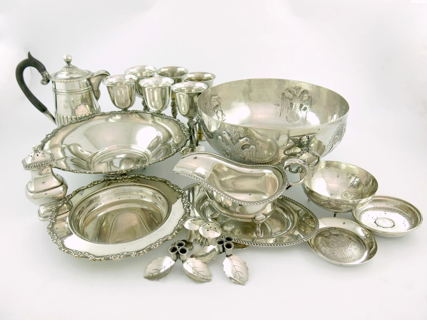 comprising metalware items: a three-handled bowl, embossed with lions, on three scroll legs with paw feet, plus a circular bowl, a small bowl, two ashtrays, and electroplated items. (qty)