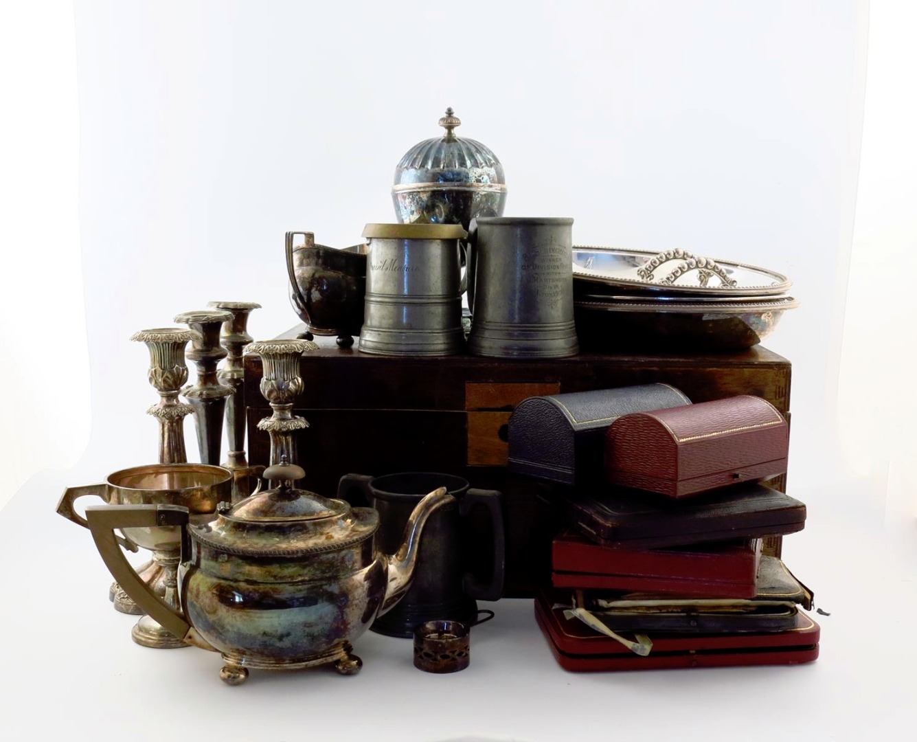 comprising silver items: a two-handled trophy cup, Birmingham 1938, plus electroplated items, two pairs of candlesticks, a teapot, a sugar bowl, a pair of entrée dishes and covers, an egg coddler, plus three pewter mugs, one with a presentation rowing inscription from Eton College, 1886, plus various empty silver cases and a wooden case, approx. weighable 4oz. (qty)