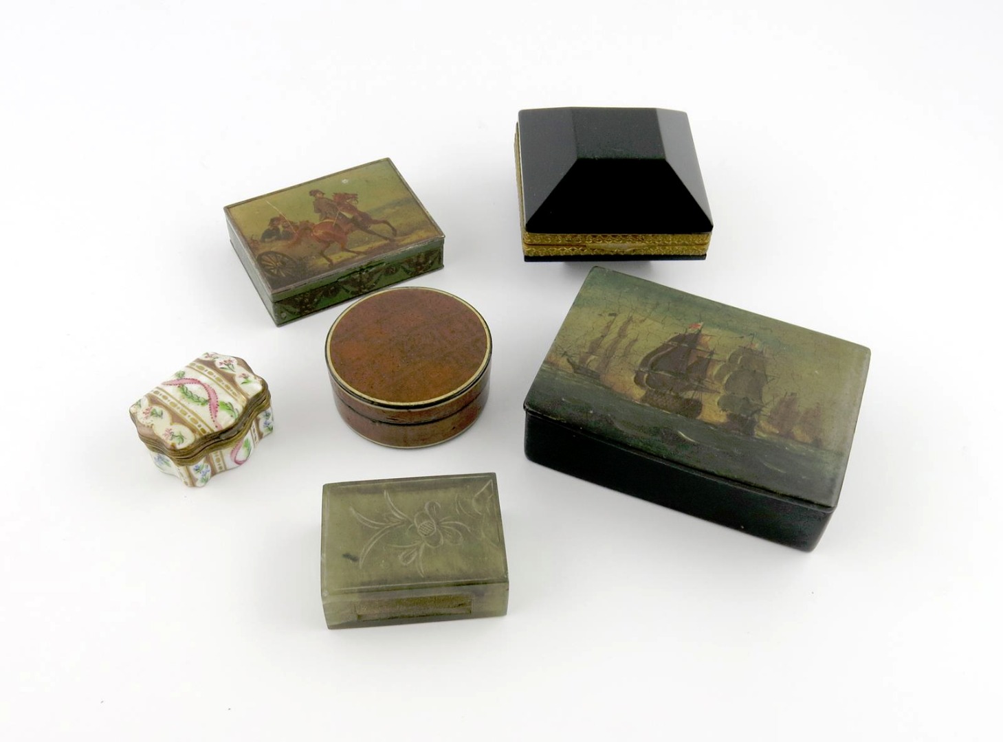 comprising: a lacquered box, the hinged cover with a naval battle scene, plus a rectangular box, with a painted scene of Napoleon on horseback, a tortoiseshell lined circular box, a glass box and a ceramic box and match box cover. (6)
