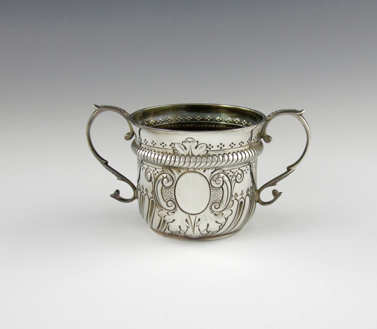circular form, scroll handles, fluted decoration, rope-work girdle, inscribed, height 8.5cm, approx. weight 5.8oz.