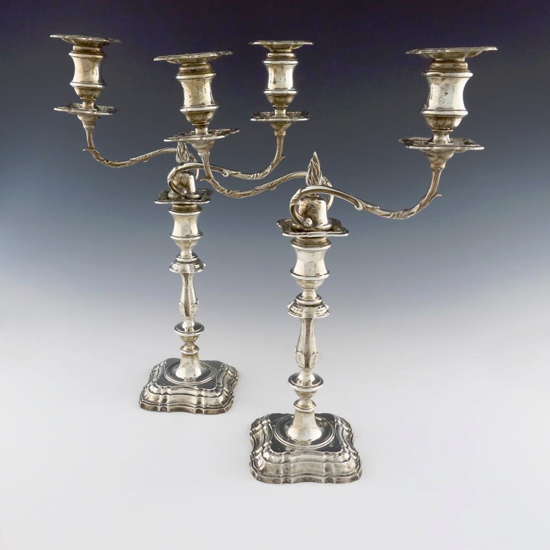 knopped baluster stems, spool shaped capitals, on raised shaped square bases, with two foliate capped scroll branches, each supporting a capital, and with a central flame finial, height 39.5cm, approx. weight of branches 34oz. (2)