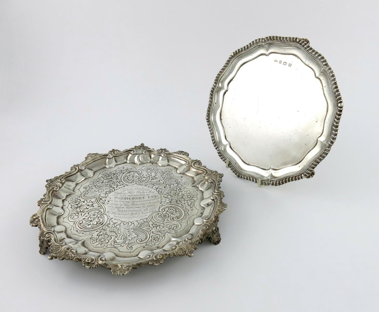 circular form, shell and scroll border, the centre chased with foliate scroll decoration, inscribed, on three shell scroll bracket feet, diameter 26.5cm, plus a silver waiter, by Birmingham 191, circular form, gadroon border, diameter 22cm, approx. weight 36oz. (2)