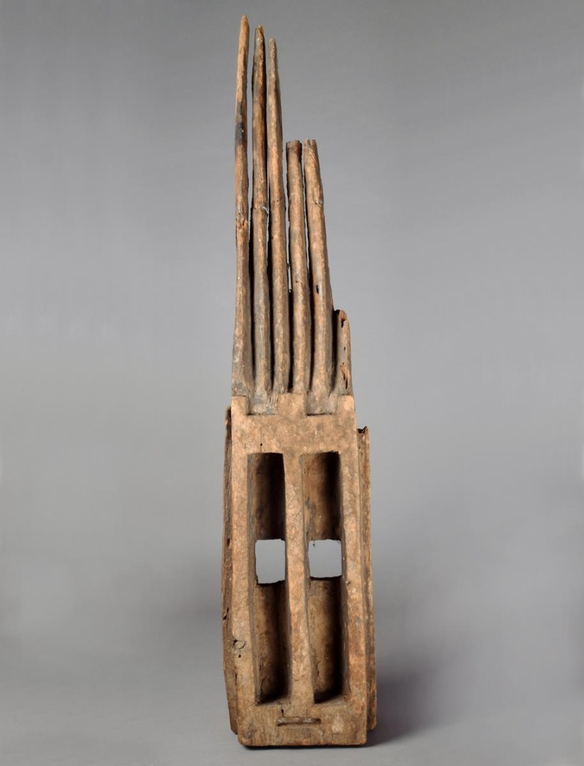 A Dogon mask, Mali, with comb coiffure and chevron incisions, 90cm high.
